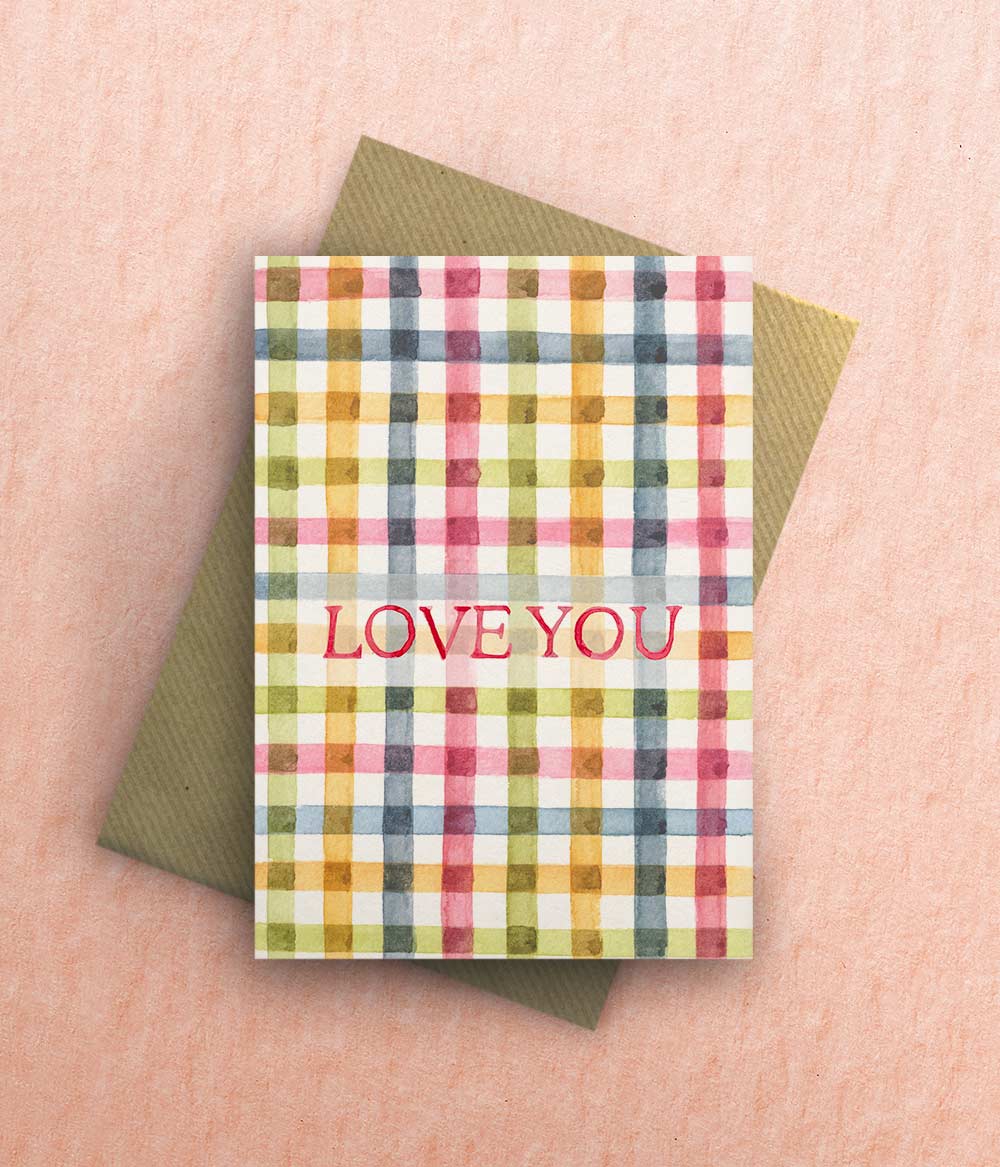 Celebrate someone special with this luxury illustrated greetings card, featuring a bright watercolour gingham design and hand-painted “Love You” lettering. Thoughtfully designed to feel both playful and heartfelt, it’s a beautiful way to share appreciation for birthdays, anniversaries, Valentine’s Day, or just because.