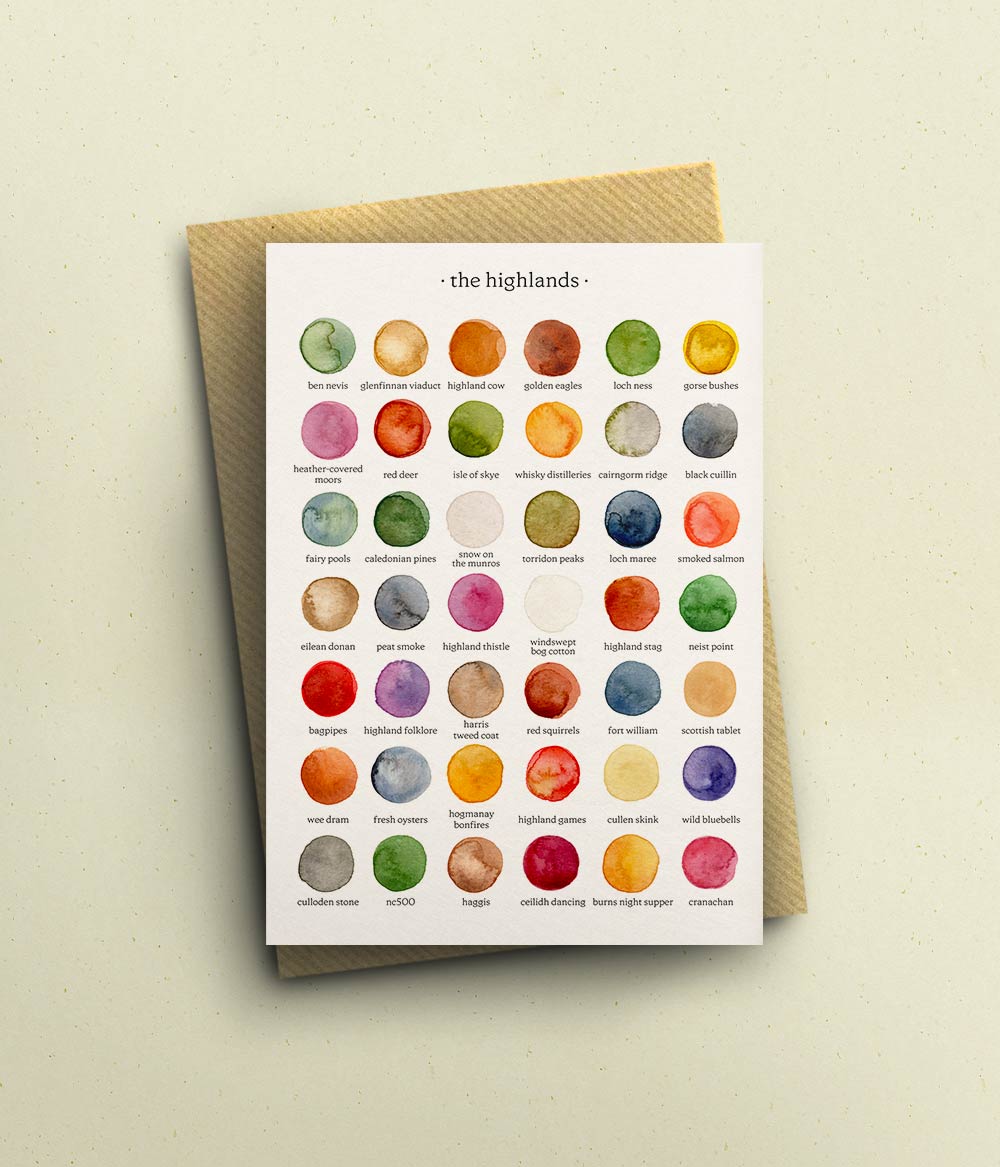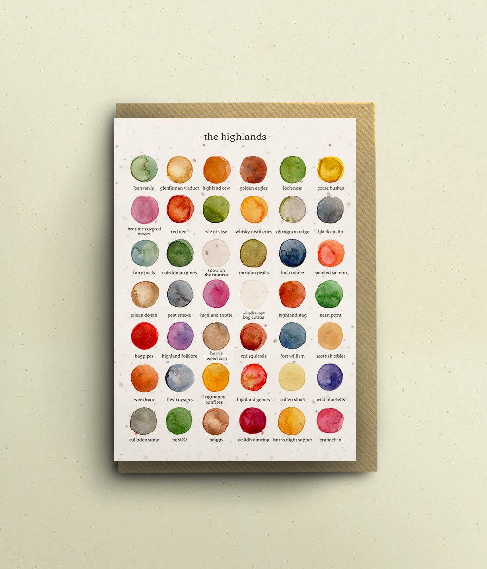 Celebrate the Scottish Highlands with this beautifully illustrated greetings card, featuring a hand-painted watercolour palette inspired by towering mountains, sweeping glens, heather moorlands and dramatic skies. Each swatch reflects the wild grandeur of this breathtaking landscape.