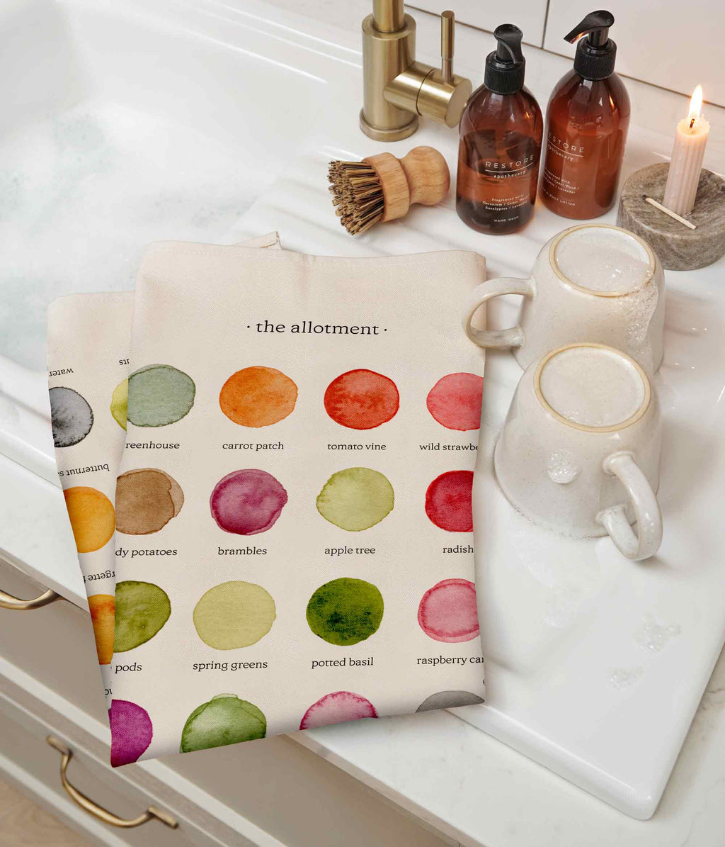 Celebrate garden life in your kitchen with this 100% cotton tea towel, featuring hues from a classic countryside allotment in watercolour swatches. The colour palette represents shades from the vegetable patch, including Rhubard, Potting Shed, Tomato Vine, Courgette Flowers and more!